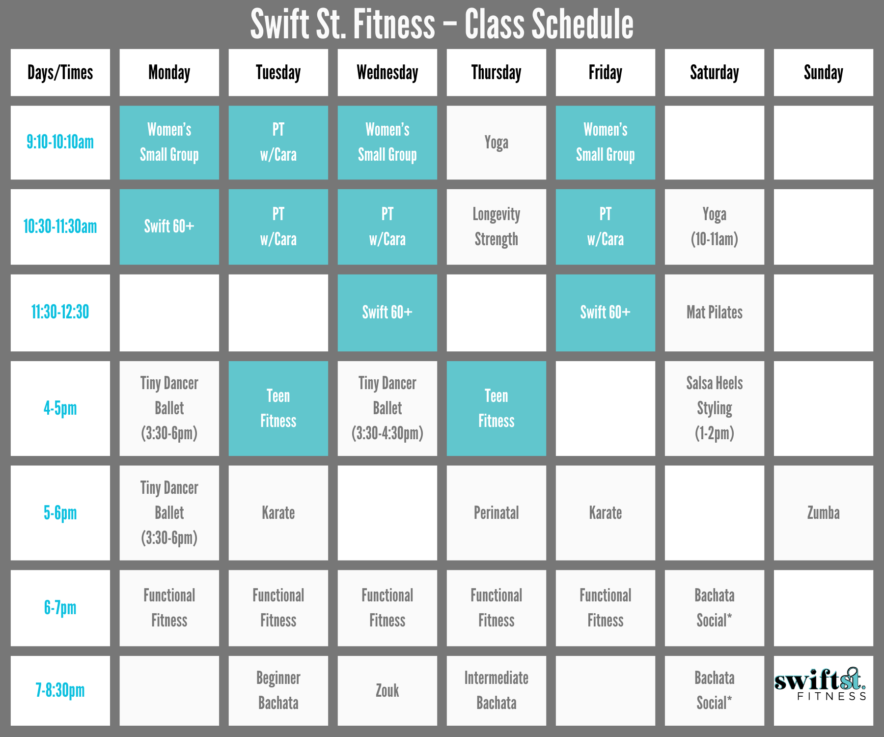 We offer various group classes, including a Women’s Small Group, Kids & Teens, and our longevity class — Swift60+.